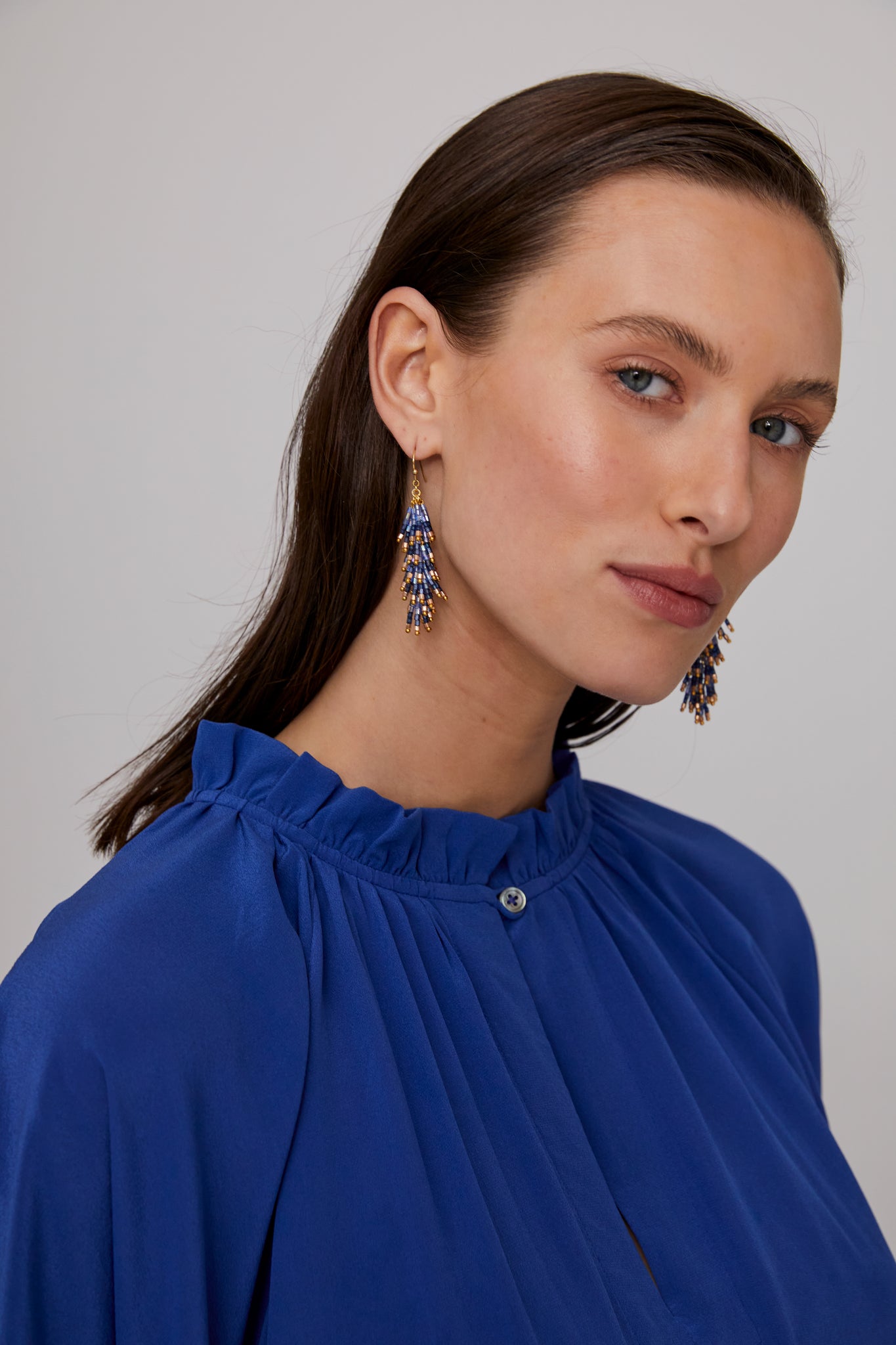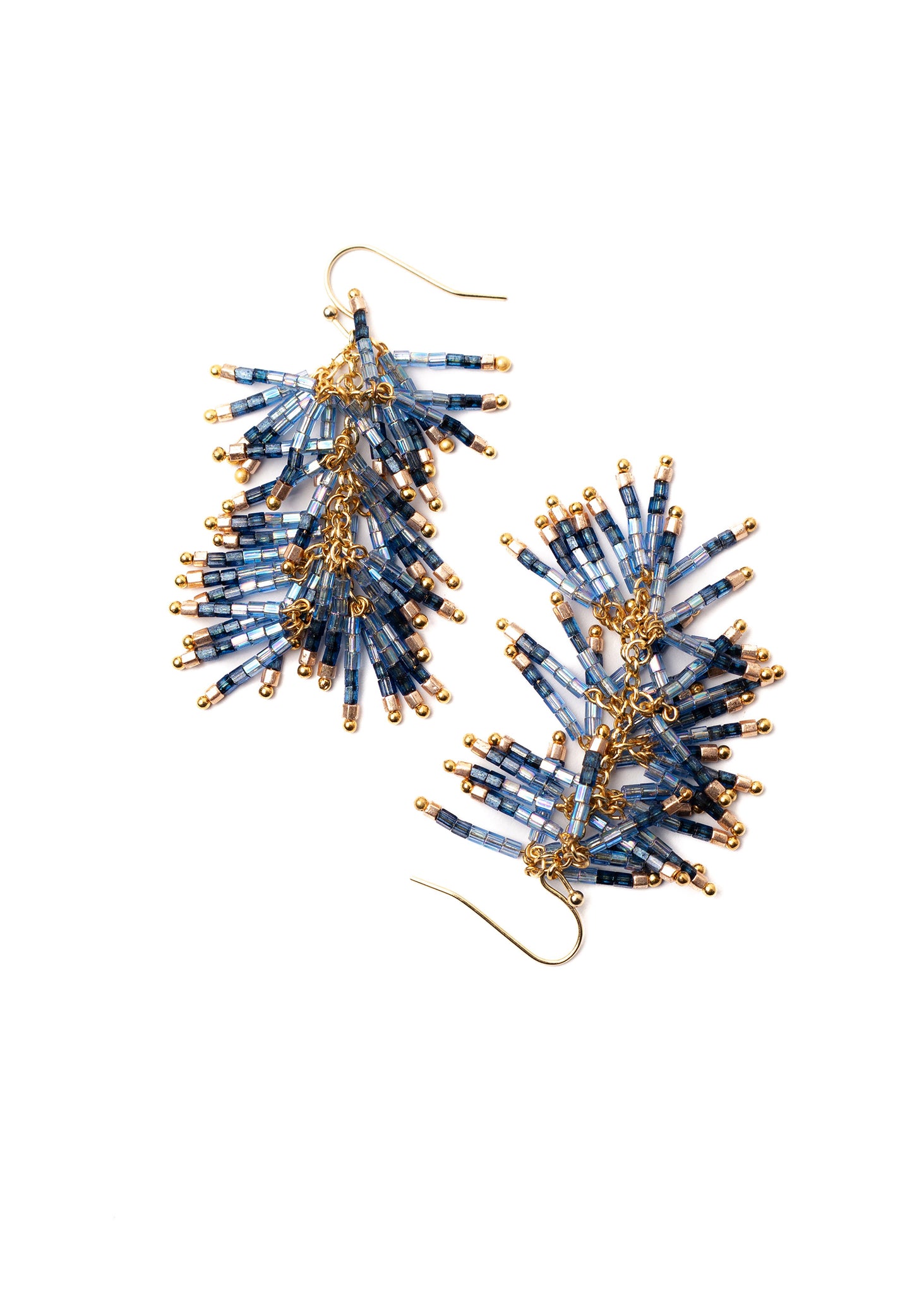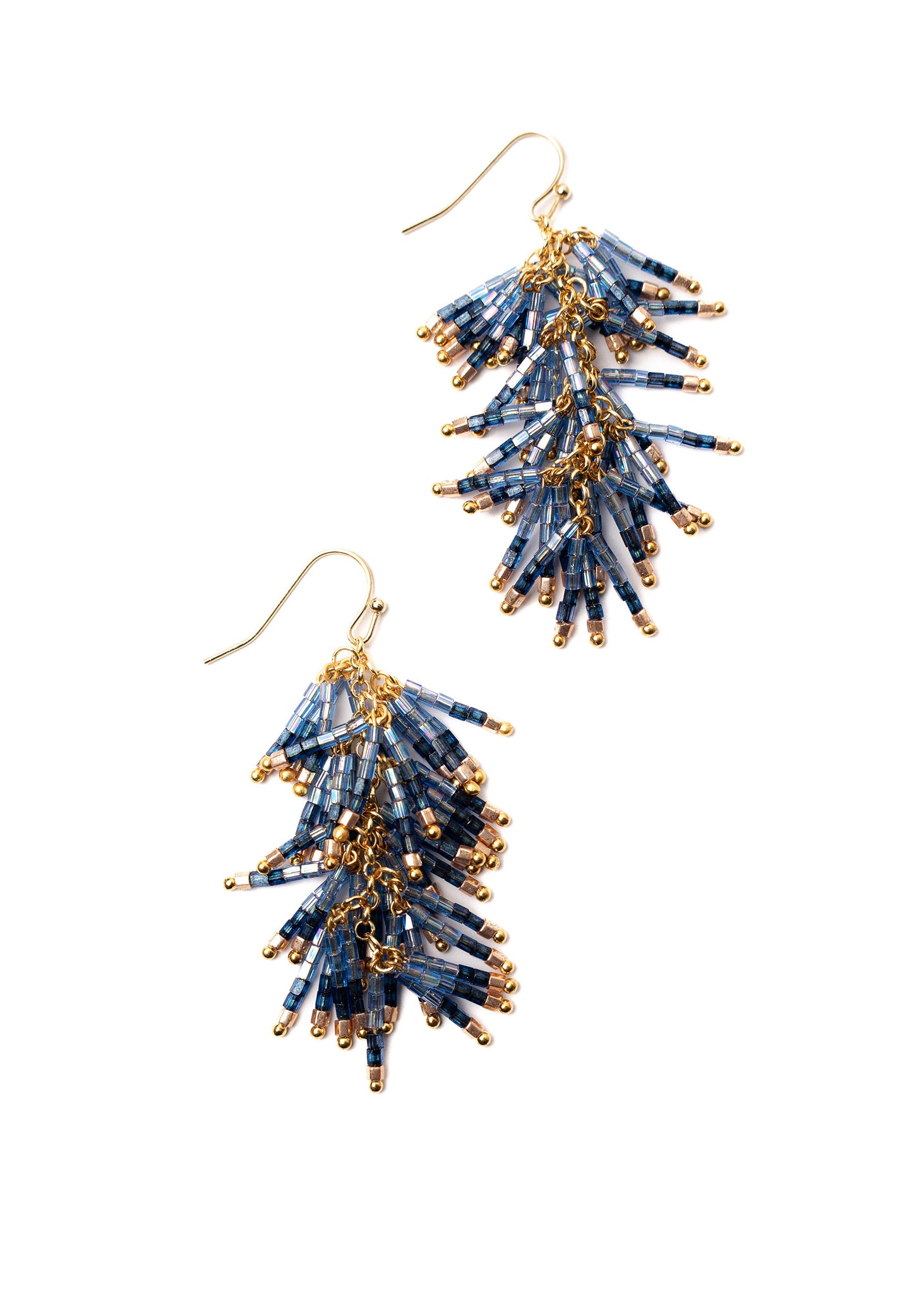 The Midnight Seed Bead Tassel Earrings are handcrafted in Jaipur and feature cascading strands of inky midnight blue Japanese glass beads tipped with gold, delicately threaded and suspended from a golden chain. Designed to shimmer with movement, they bring a refined yet playful touch of colour to your look. Lightweight and comfortable, they are an effortless way to elevate both day and evening styling.