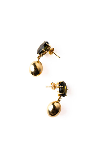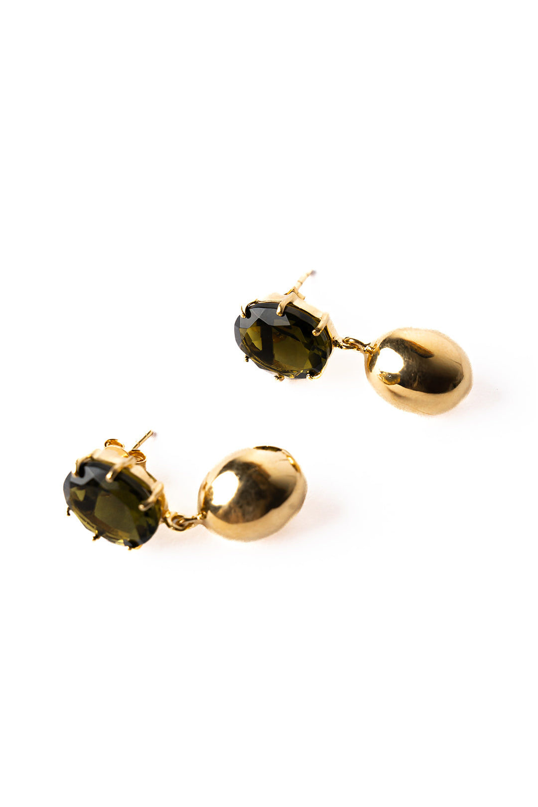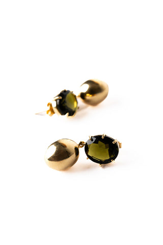 Handcrafted in Jaipur, the Moldavite & Gold Drop Earrings are a design of refined elegance. A faceted moldavite crystal of deepest olive, clasped in a golden setting, rests neatly on the lobe - its rich hue catching the light with subtle brilliance. Suspended below, an egg-shaped drop is hand-cast from 925 sterling silver and finished in 24ct gold micron plating. Timeless and feminine, they make a thoughtful gift - for yourself or someone special.