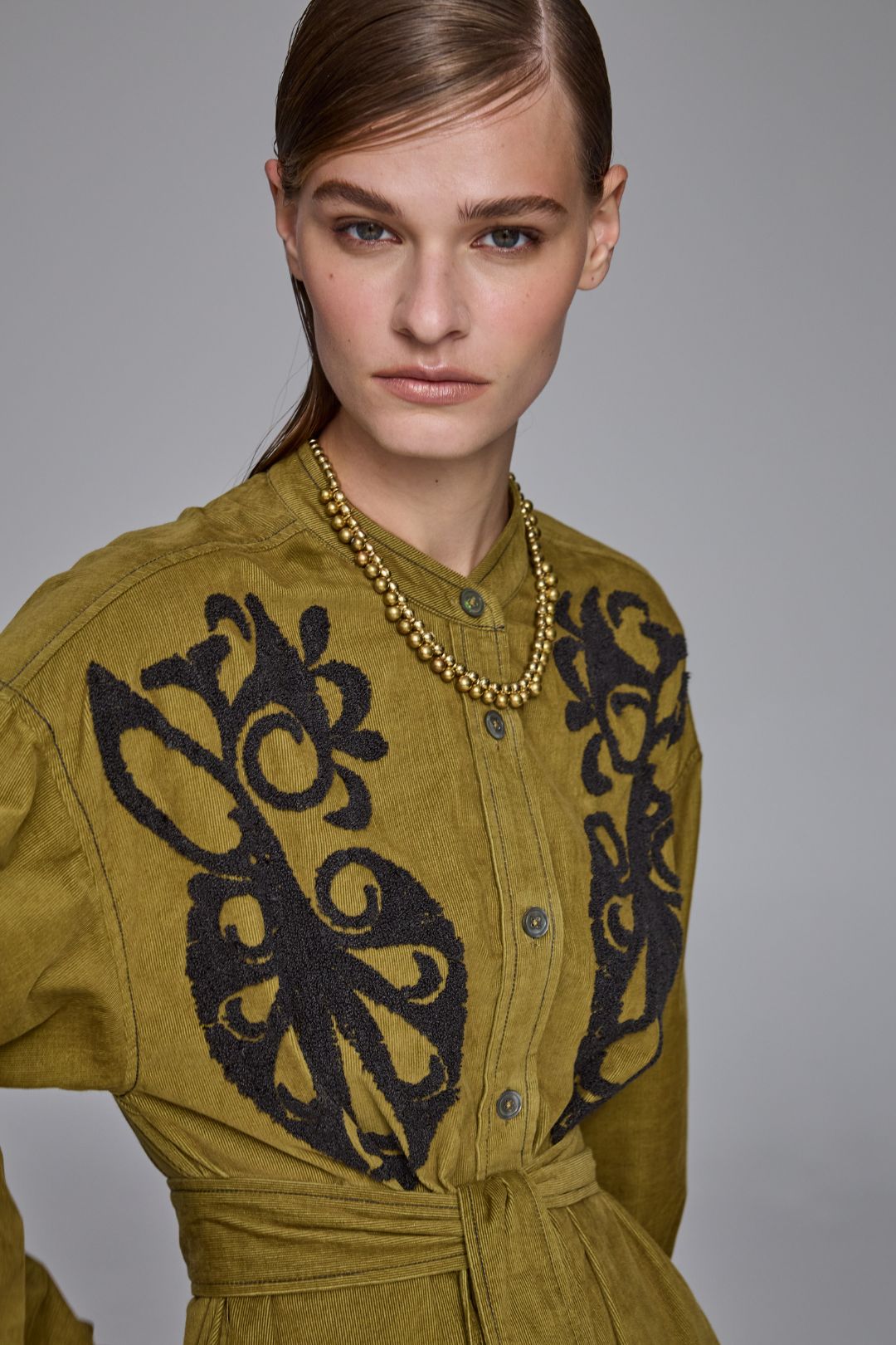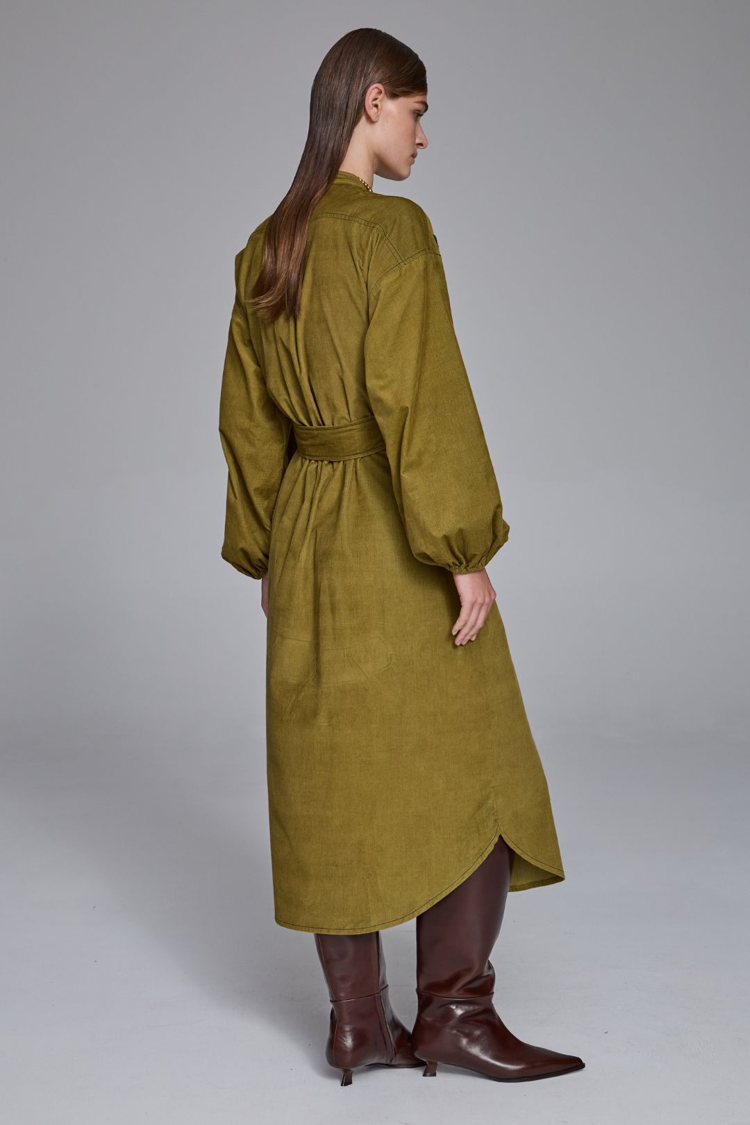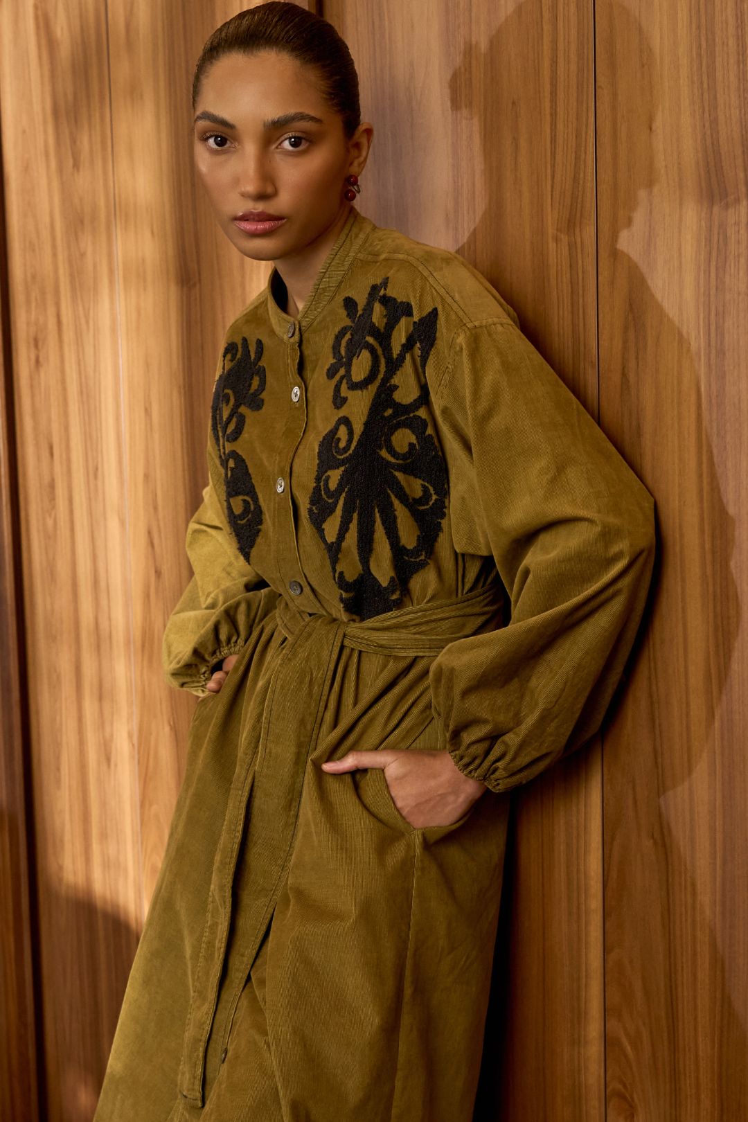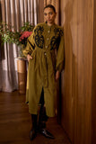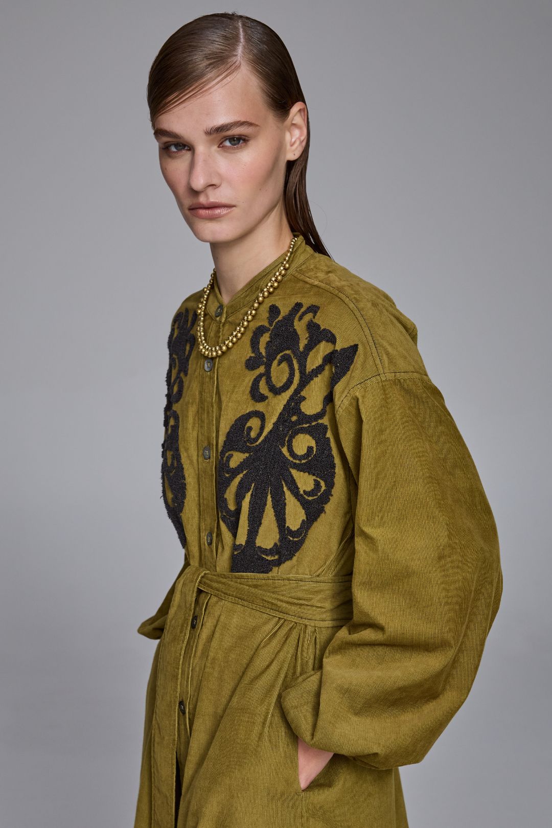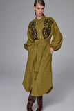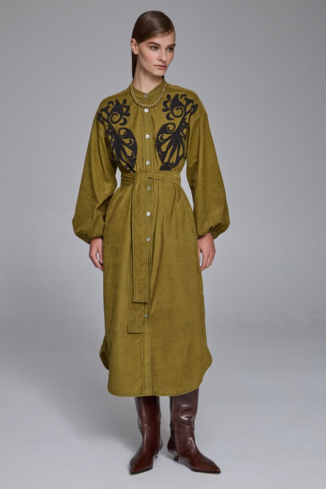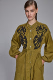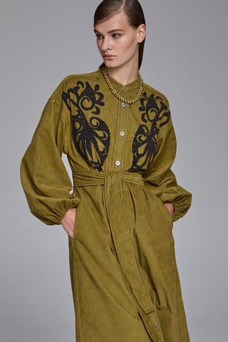 The Daria Pin Cord Shirt Dress fuses the laid-back ease of lichen green pinwale corduroy with a feminine, handcrafted charm. Tonal bouclé-embroidered paisley motifs add rich texture and artistry to the front, elevating this cosy winter favourite into something truly special. With its relaxed fit, extended shoulder seams, and softly gathered sleeves, it’s warm, wearable, and effortlessly chic. A modern winter day dress that’s as individual as it is timeless.