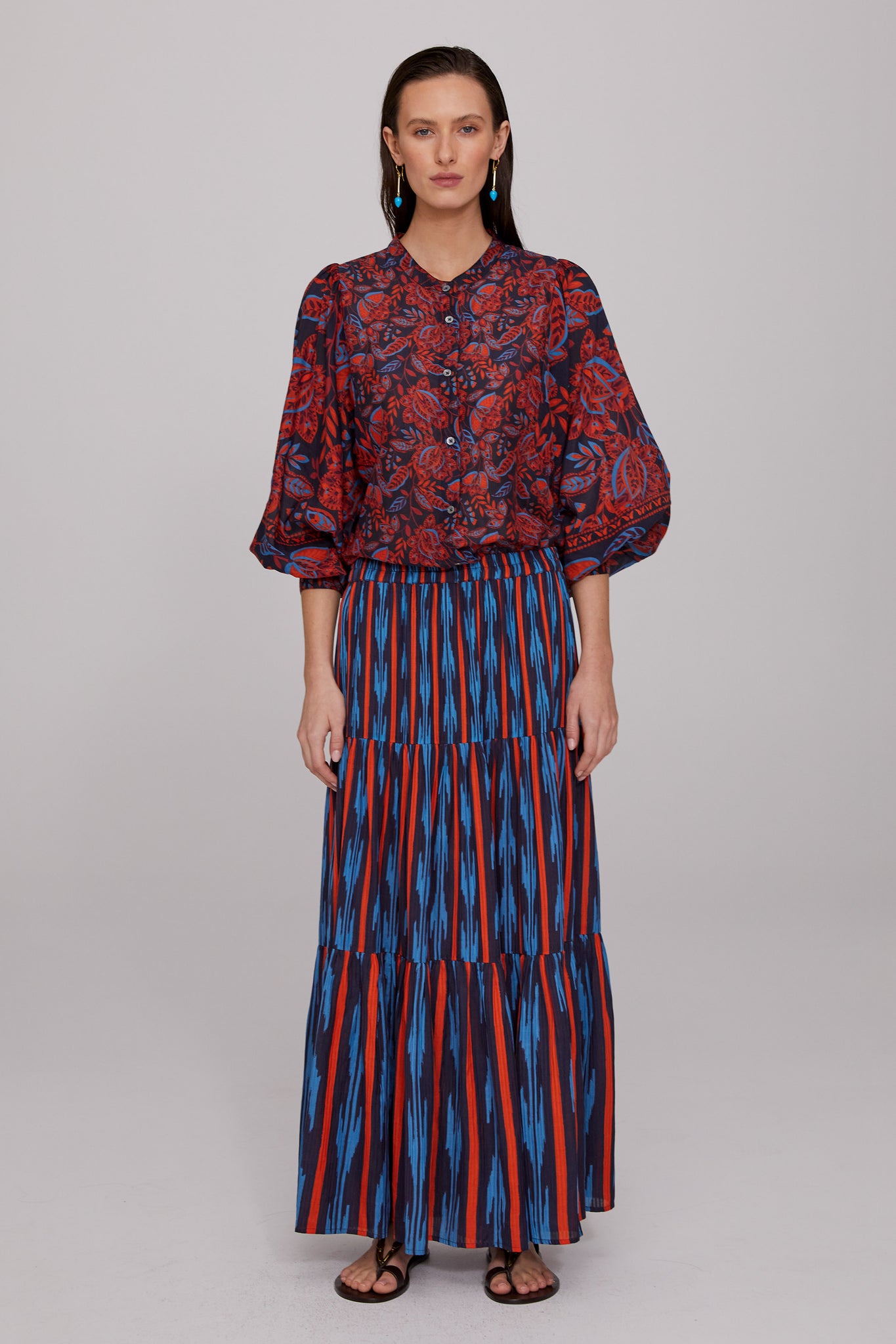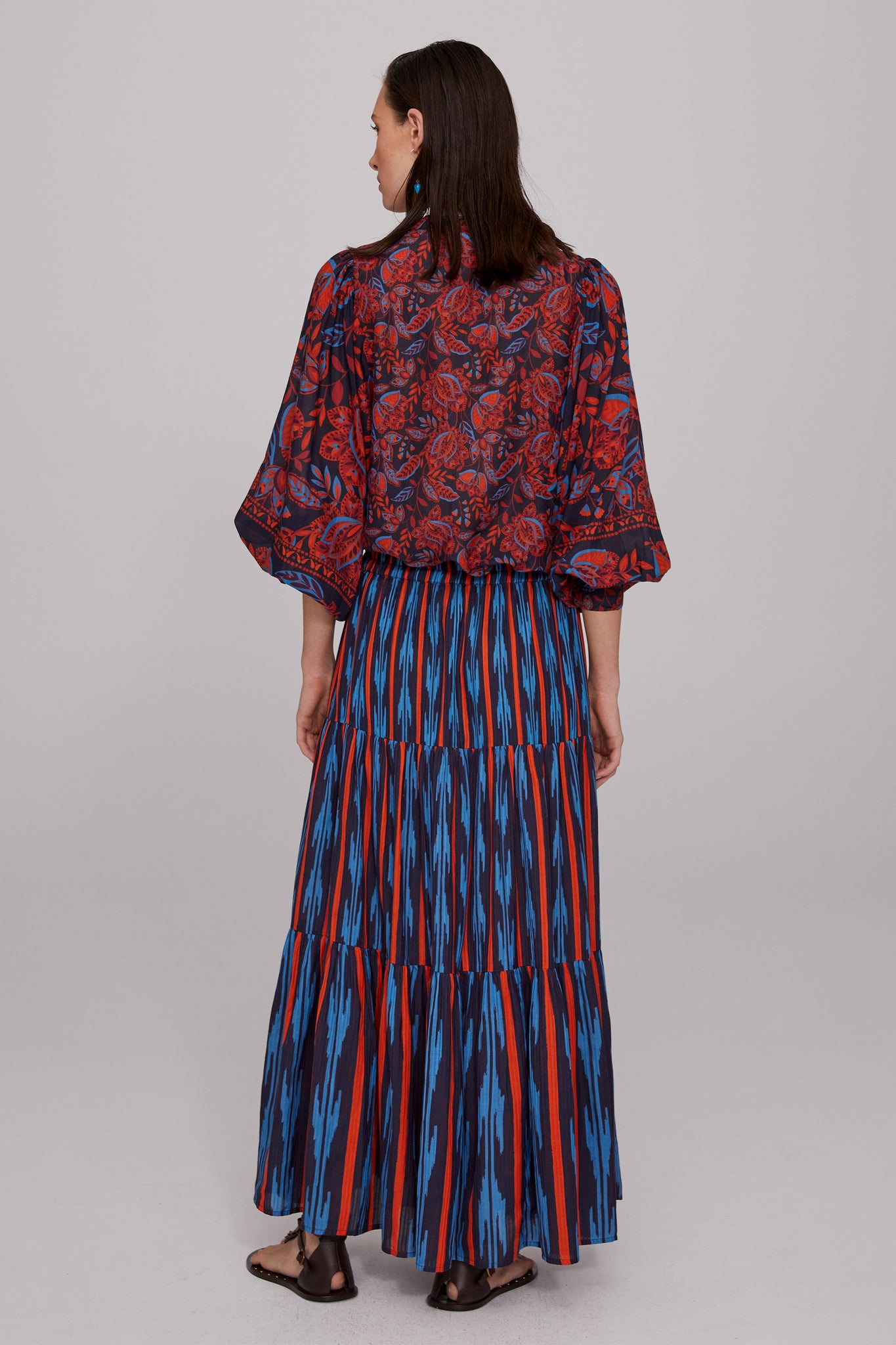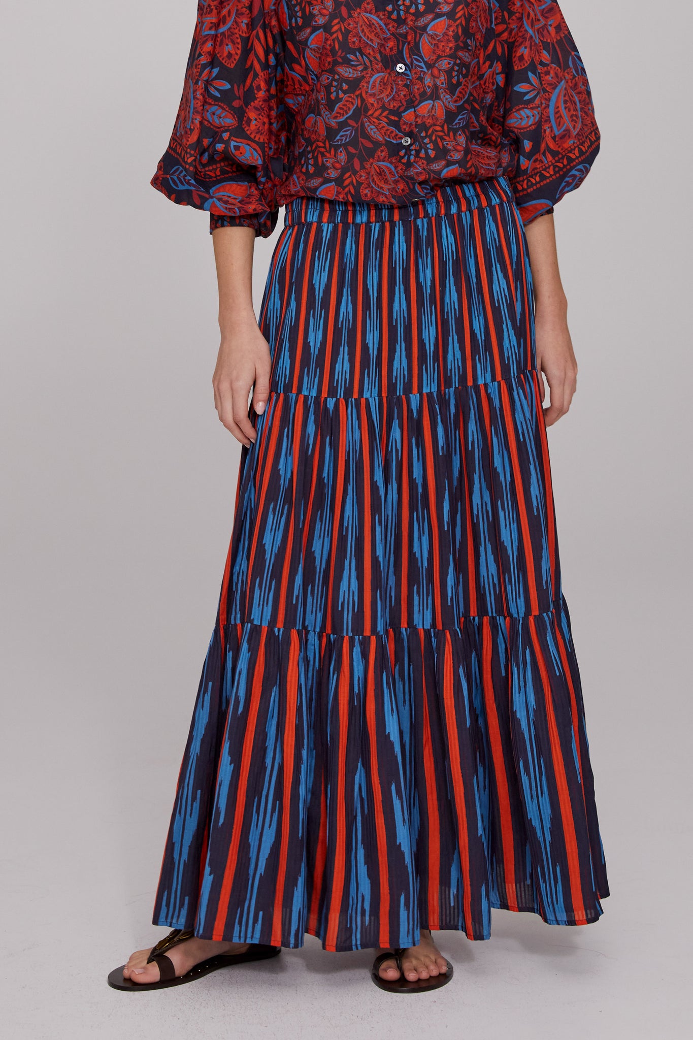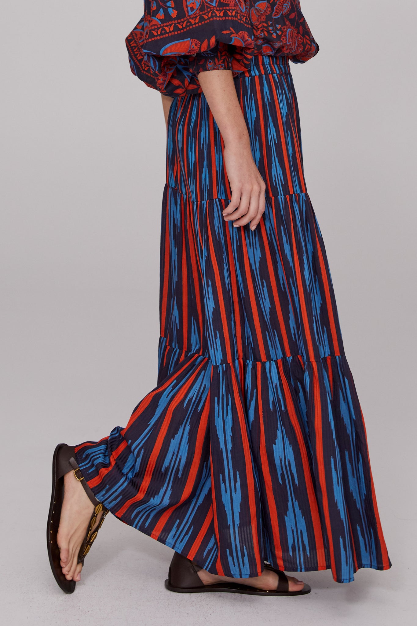 The Elivia Sateen Stripe Tiered Skirt moves effortlessly from day to evening. Designed in a signature ikat-inspired stripe of turquoise and red on a dark ink base, it falls into sweeping ankle-grazing tiers that capture a modern bohemian spirit. The elasticated waistband and flattering yoke ensure both ease and comfort. Style with a simple tee by day or pair with the Ariana Silk Cotton Blouse for a striking, co-ordinated look of the season.
